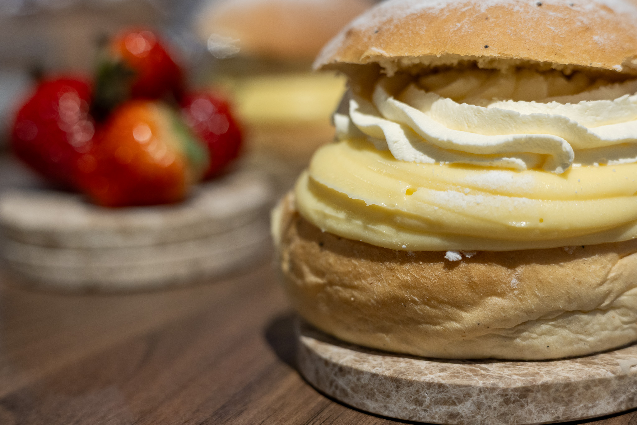 Søndag 15. februar markeres Fastelavn, men allerede nå får du kjøpt disse saftige og smakfulle fastelavnsbollene hos Kjøkkenskapet. Bollene er fylt med vaniljekrem, jordbærsyltetøy og kremfløte.