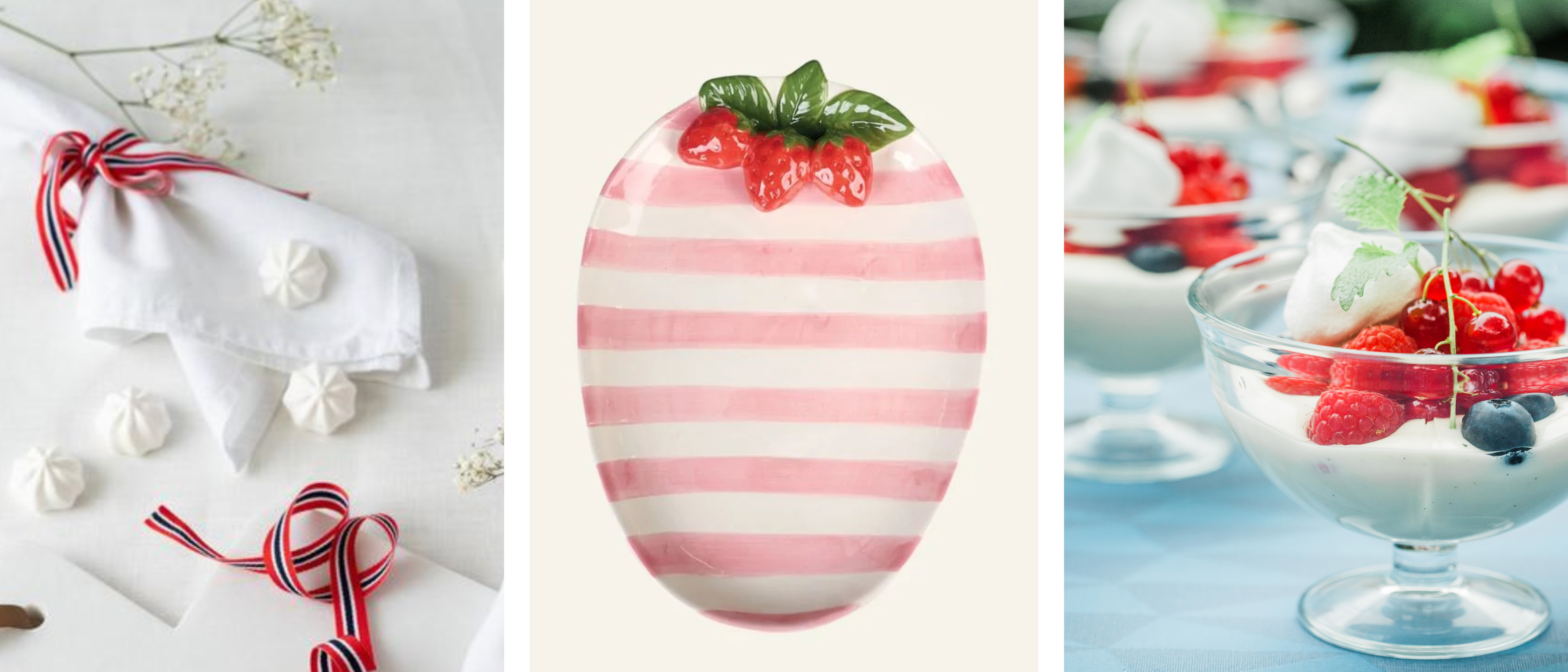 Bruk en hvit duk som base og la detaljer i rødt, hvitt og blått sette prikken over i´en. Topp med blomster av brudeslør eller selvplukkede markblomster for et gjennomført og personlig bord som gjør feiringe enda mer minneverdig!